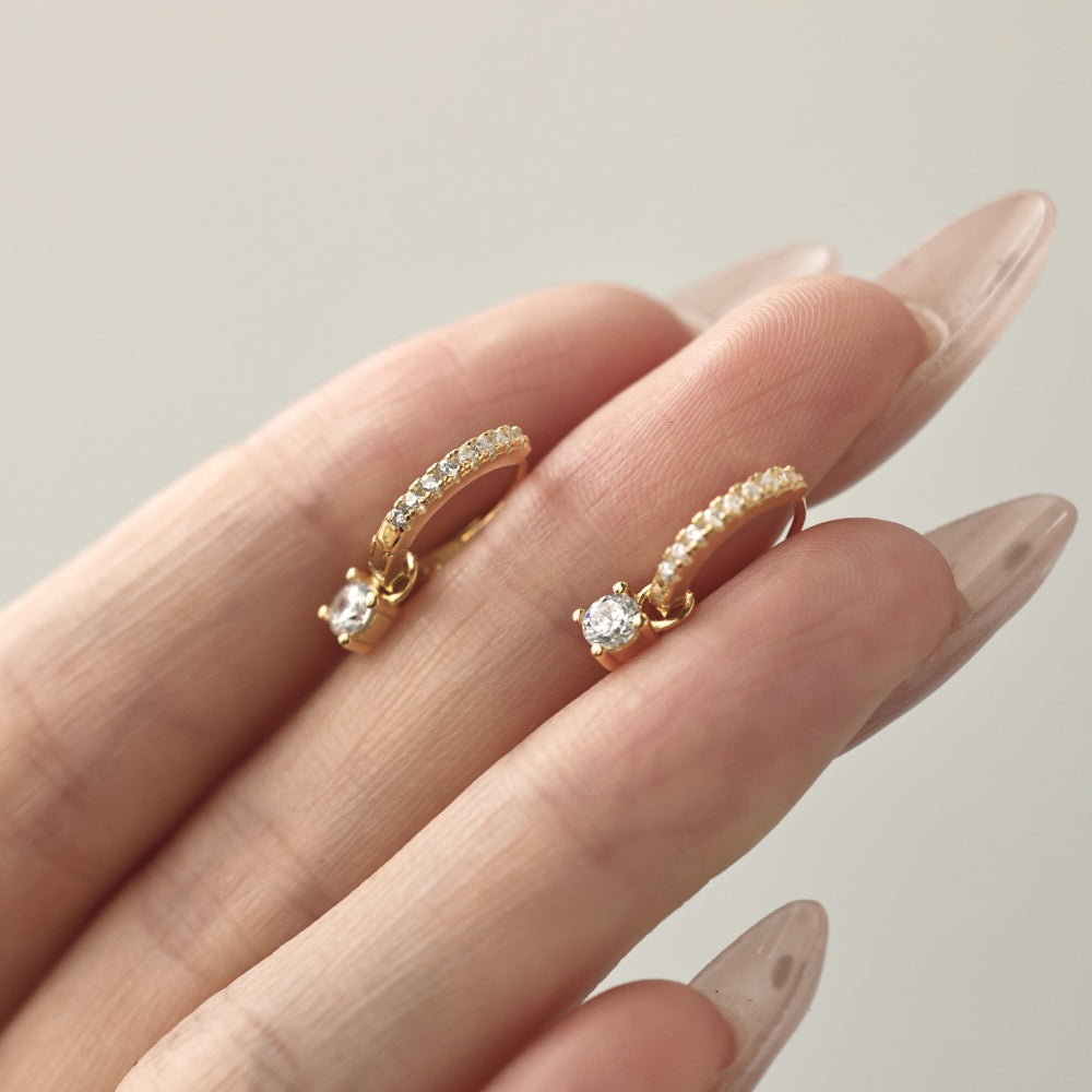 Darla's Dew Drops earrings showcase a graceful half cubic zirconia design paired with a delicate hanging square diamond. These refined earrings offer a subtle sparkle that enhances any ensemble with an elegant, sophisticated touch. Perfect for adding a hint of timeless beauty to your look.